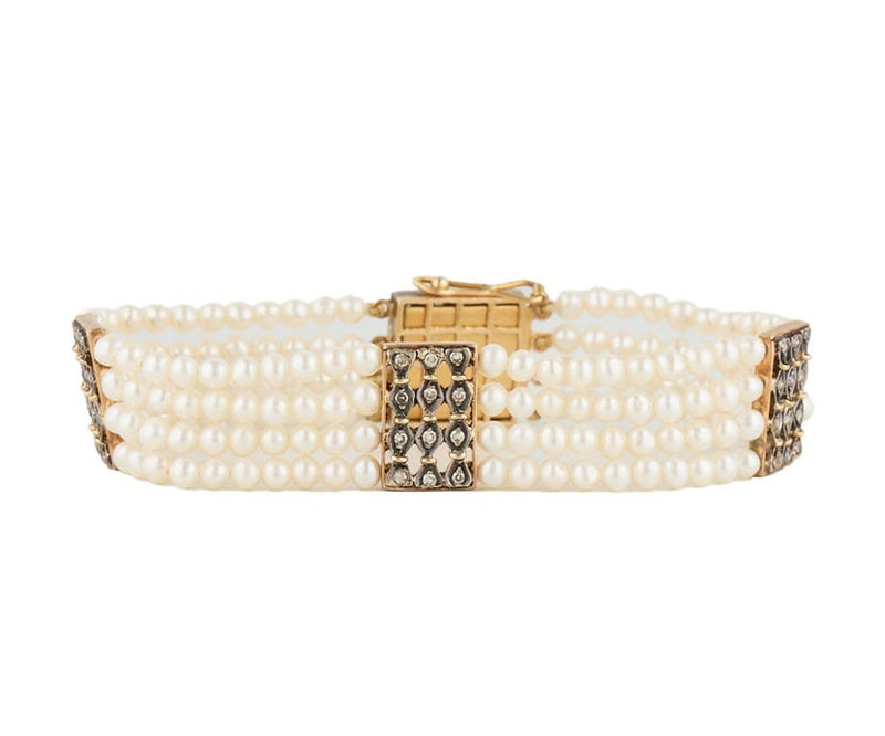 Vintage Seed Pearl and Diamond Multi Row Station Strand Bracelet in 18K