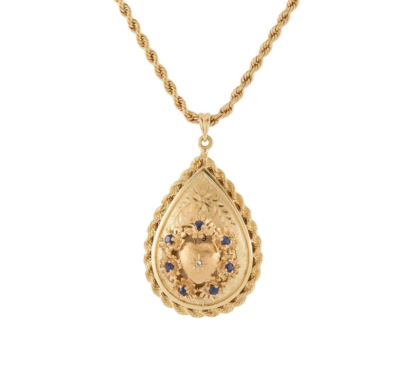 Vintage 0.55ctw Sapphire Geneva Clock Locket Pendant Necklace in 14K