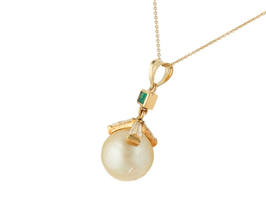 15.0MM Pearl Emerald and 1.00ctw Tapered Baguette Diamonds Pendant Necklace 18K