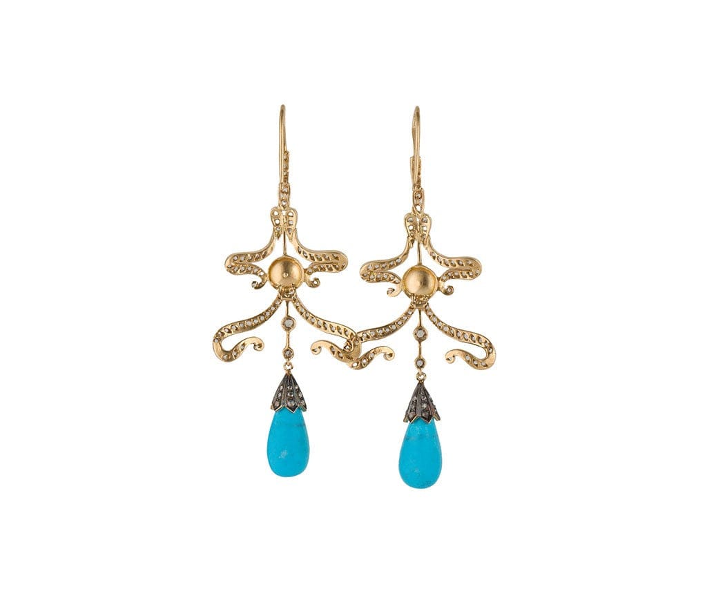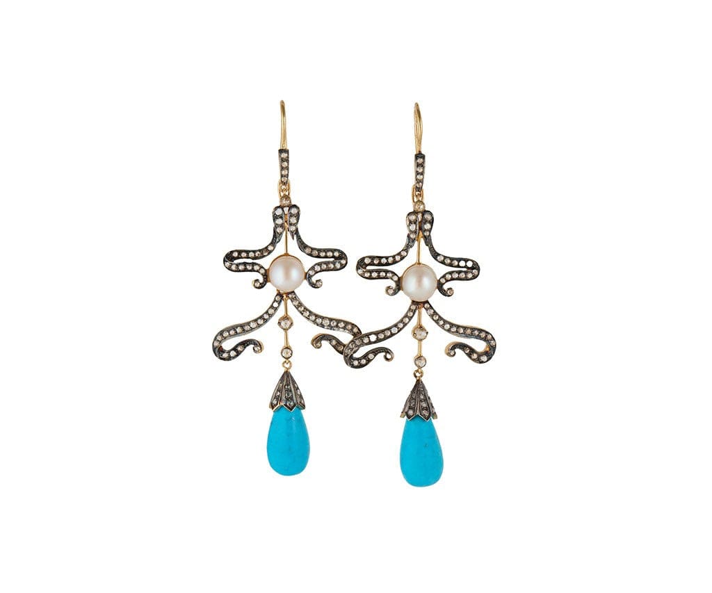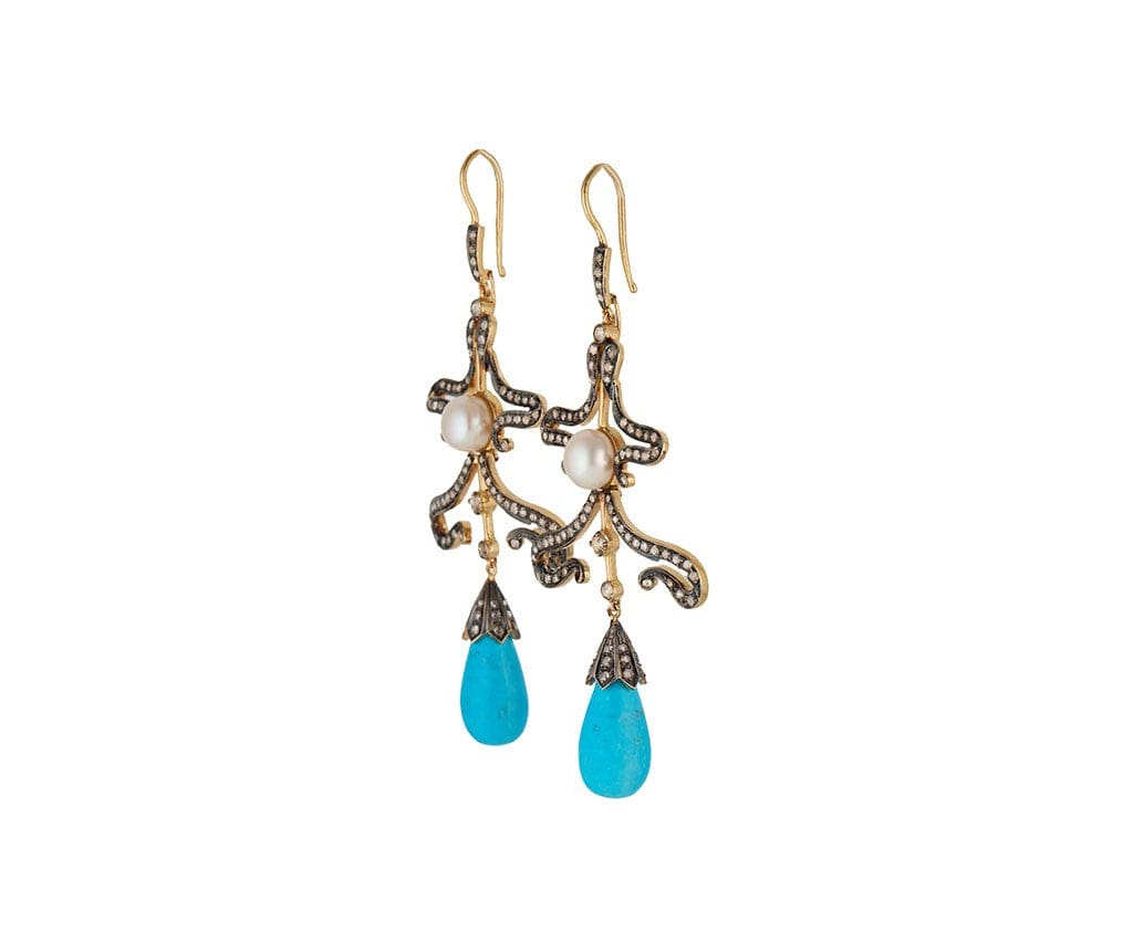 3.00ctw Rose Cut Diamond Pearl and Turquoise Chandelier Dangle Earrings in 18K