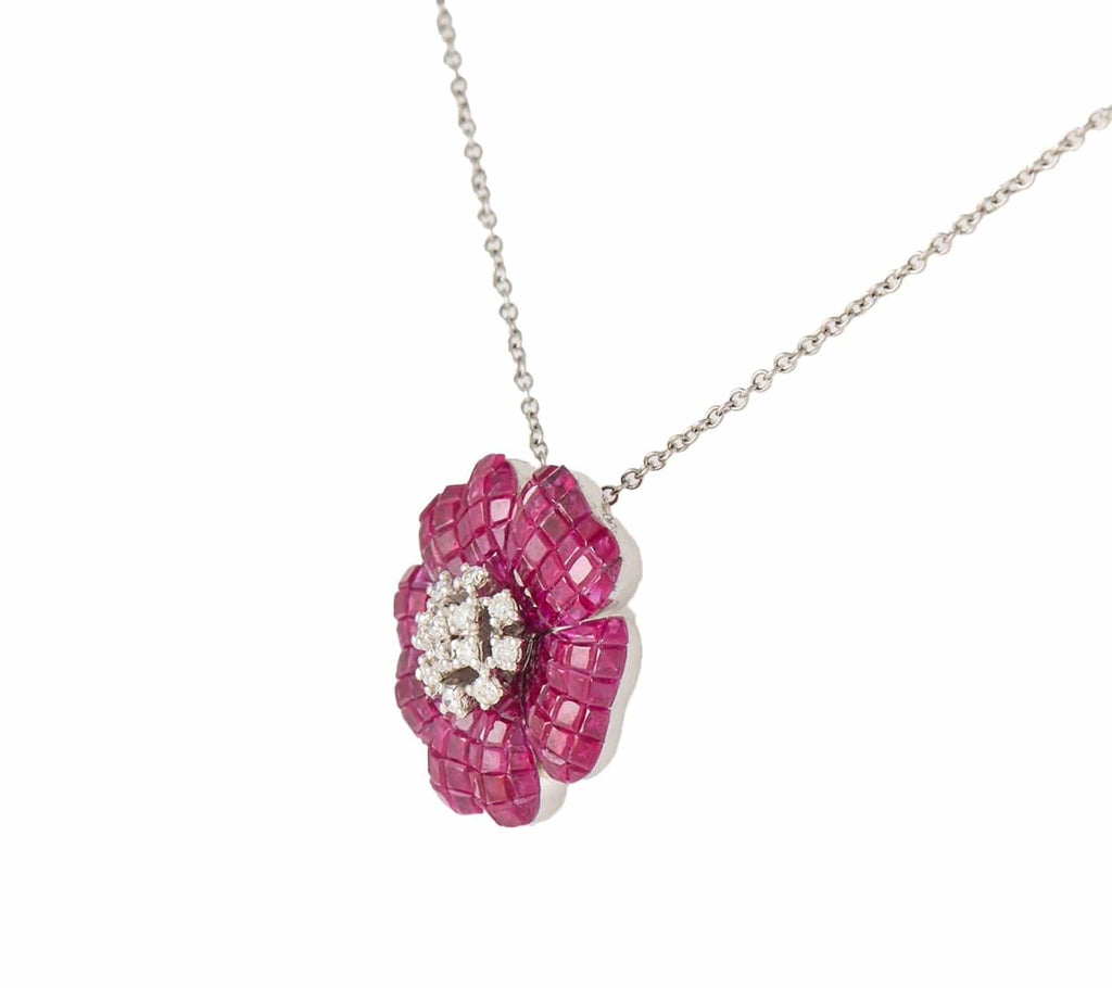 8.00ctw Rubies and 0.70ctw Diamond Cluster Flower Pendant Necklace in 18K