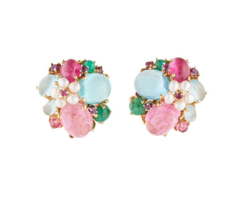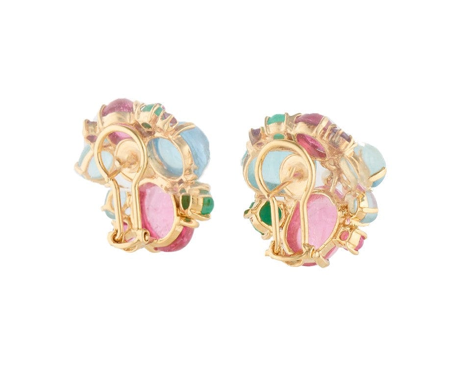MultiColored Gemstone and Seed Pearl Omega Back Earrings in 14K