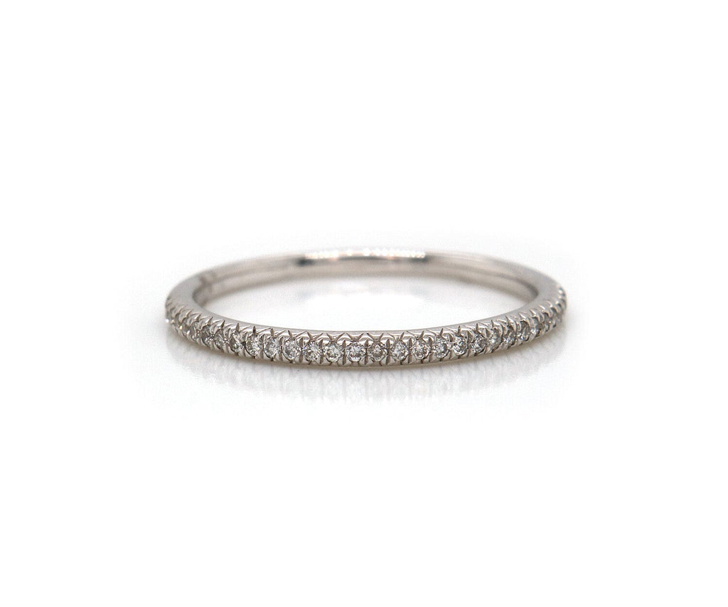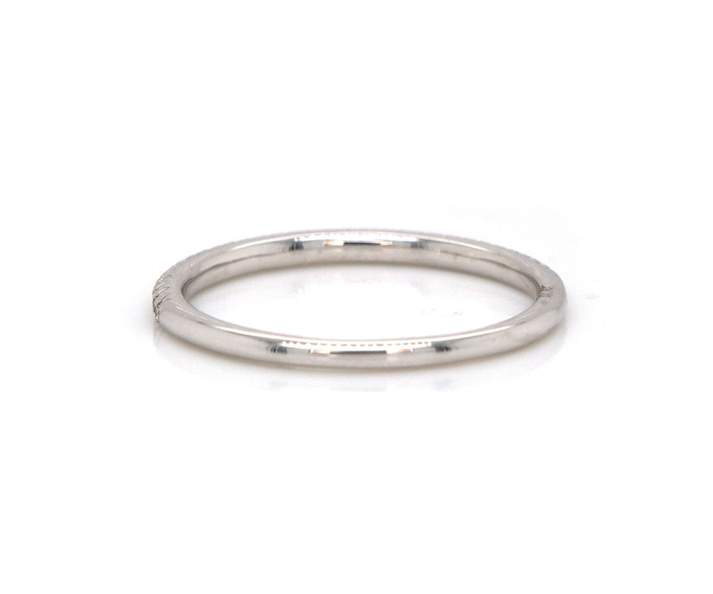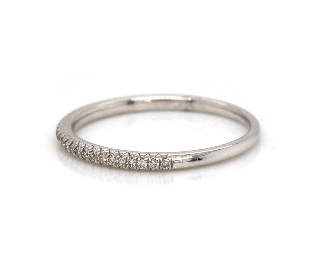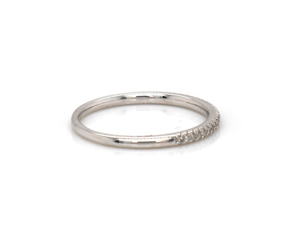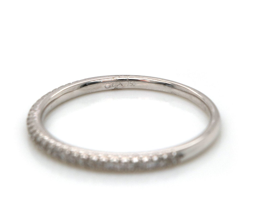 This petite stackable band from Odelia brings a fun and flirty look to your stack. Crafted in cool 18K white gold, this slender design features prong set diamonds flanked by coin-edged borders. Sparkling with 0.14ctw of diamonds and a bright polished shine, this delightful stackable expresses your sense of style. The hallmarks are located on the inside of the band.