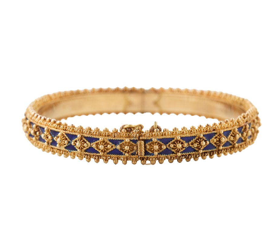 Retro Blue Enamel Etruscan Style Bangle Bracelet in 14K