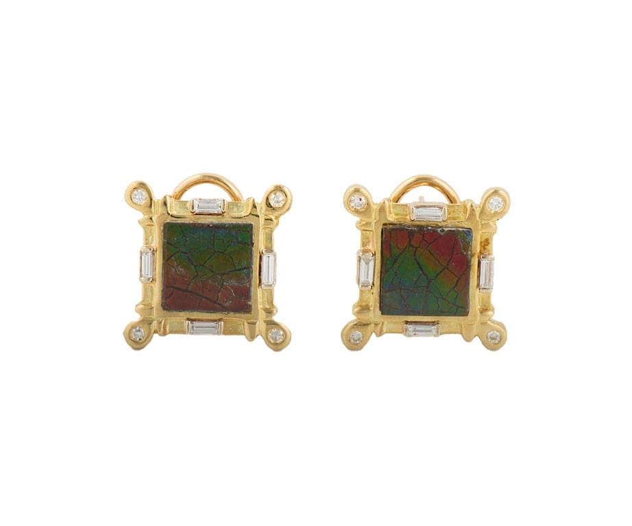 Square Shaped Ammolite and 0.25ctw Baguette and Round Diamond Earrings in 18K